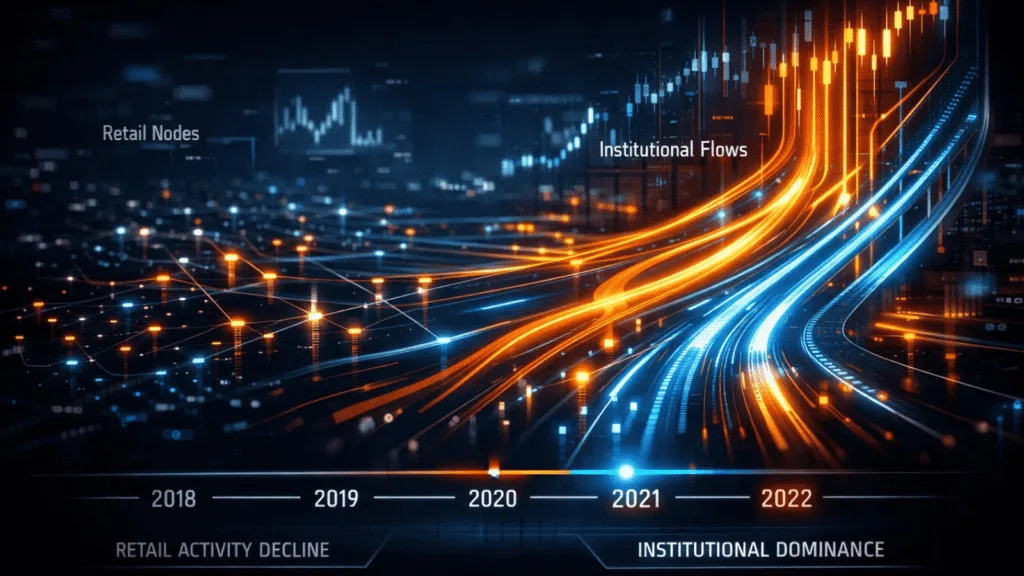 The result is a market that looks structurally different from anything seen in prior cycles, institutional accumulation happening steadily while retail interest sits near historic lows..