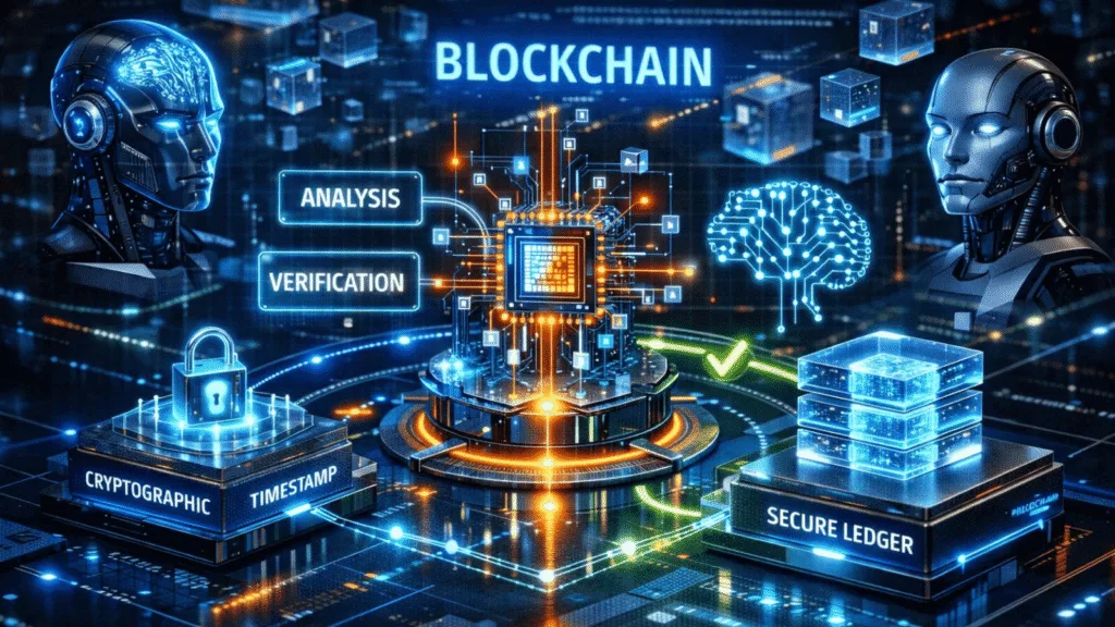 The blockchain-based audit trail system stores AI datasets and models through an on-chain method which does not allow direct data storage. The approach incurs high economic costs while facing major technical difficulties. The system uses cryptographic fingerprints to secure its decision-making processes which maintain the ability to reconstruct decisions. The system creates a record of every AI operation which includes the model version hash and data input details for that particular block height and the computed probability distribution for the action that was performed. The system records both confidence intervals and state transitions that occur between executions.