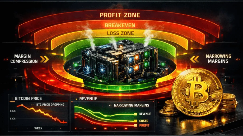 The recent downturn in crypto markets has triggered a quiet but significant structural shift beneath the surface of price action. Although Bitcoin maintains its technical integrity across extended timeframes, its mining ecosystem displays margin compression patterns that will impact upcoming months’ liquidity flows. Mining profitability exists as a market variable which affects all miners. The supply system operates according to the economic laws which control hash power. The current price environment is beginning to test that equilibrium.