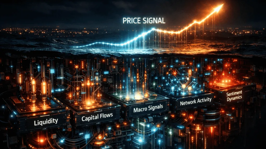 The majority of individuals begin their market analysis research from price information. People begin their market analysis after they observe Bitcoin movements and Ethereum support failures and altcoin price increases. The reason for price changes exists beyond the surface level. The hidden processes which operate beneath the surface of the market control price movements.