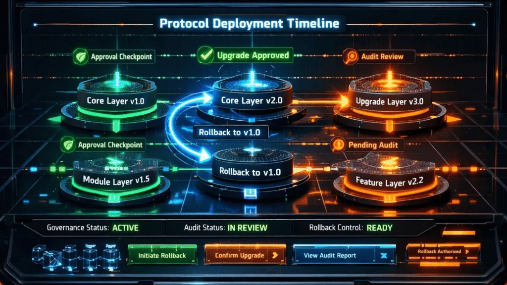 The system keeps an on-chain record of every operation which includes all proposals and all approvals and all executions and all rollbacks and all deprecations. The system establishes a complete record which documents who approved changes together with the specific times of those changes and the software versions that were active during that period. Auditors and regulators can reconstruct contract state with cryptographic certainty rather than relying on off-chain documentation.