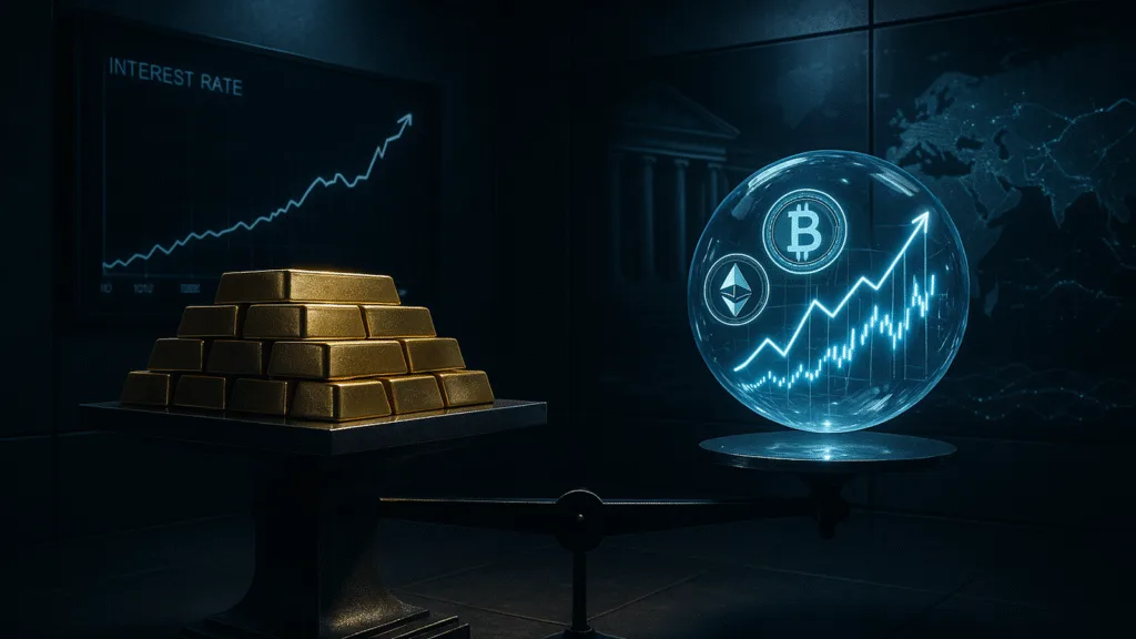 In addition to competing on narrative or scarcity, store-of-value assets also compete on the yield you forfeit by holding them. The “carry hurdle” for any asset that does not pay increases when risk-free cash rates are close to multi-decade highs. The return on gold, the traditional yieldless reserve, is dependent on both price growth and liquidity preference. Bitcoin can be classified as either a yield-bearing asset when it is routed through cash-and-carry arbitrage, lending, or staking-like schemes, or as a yieldless bearer asset like pure gold. Therefore, the current regime poses a straightforward question with intricate mechanics: is it more advantageous to store capital in T-Bills or stablecoin cash equivalents than to hold gold or spot Bitcoin, and how does this cost vary with changes in real rates, basis, and crypto financing dynamics?